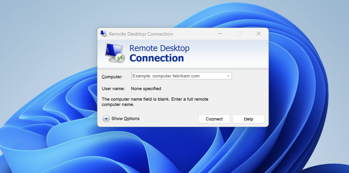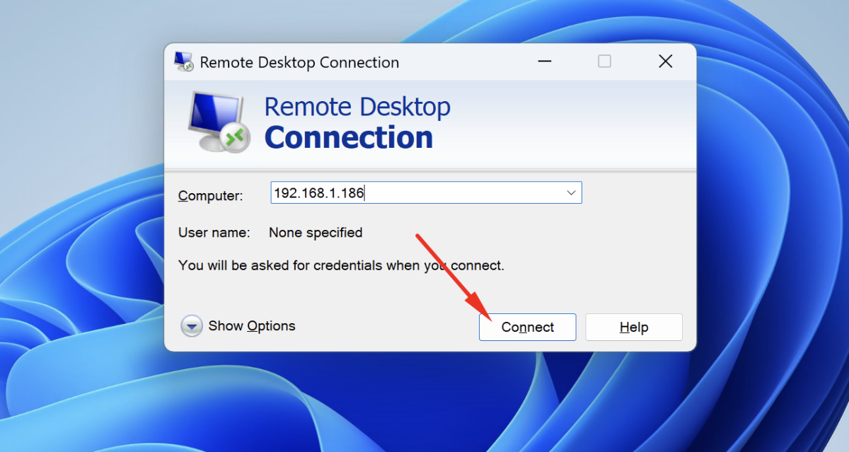 - Open Remote Desktop Connection (Windows) or any RDP client