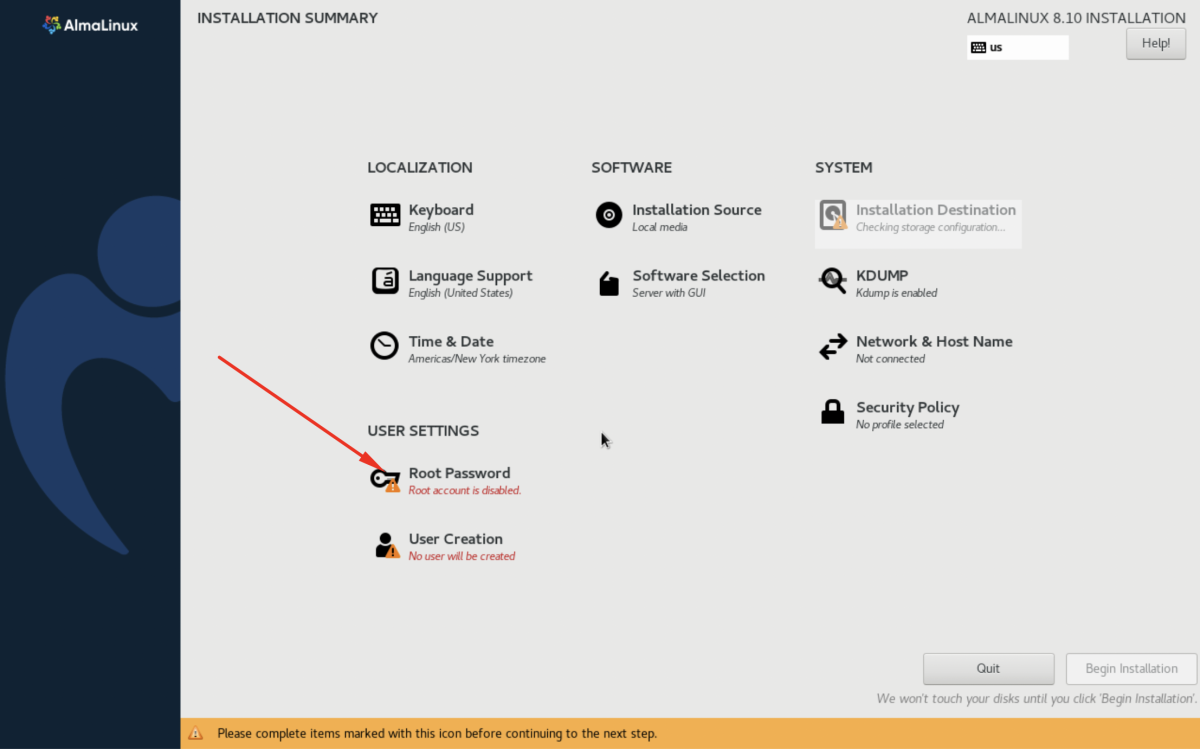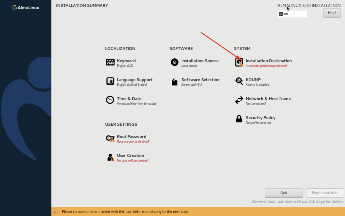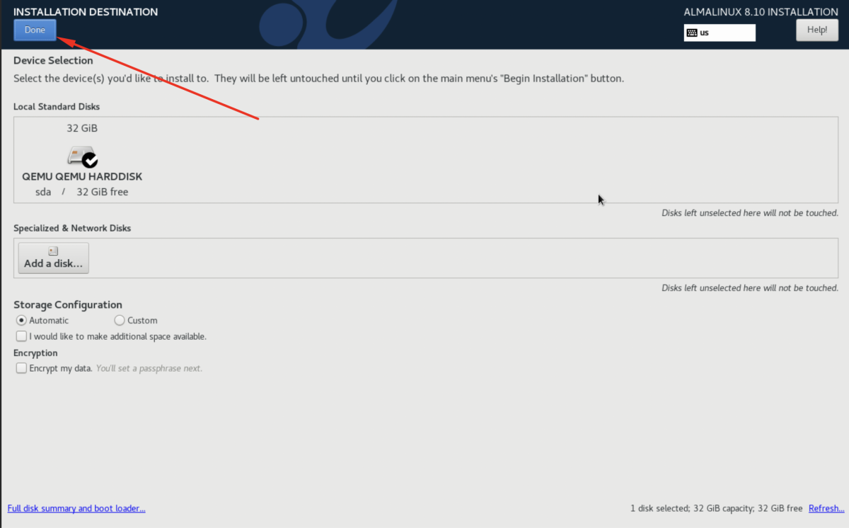 Step 4 : On the Installation Summary screen, click Installation Destination and select the disk where AlmaLinux 8 will be installed.