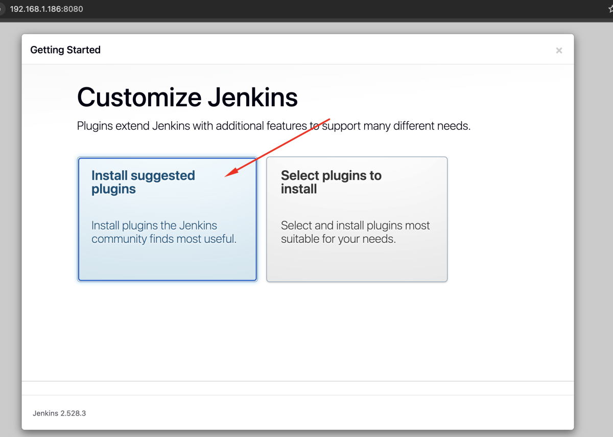 - Choose Install suggested plugins and wait for Jenkins to download and install the required plugins.