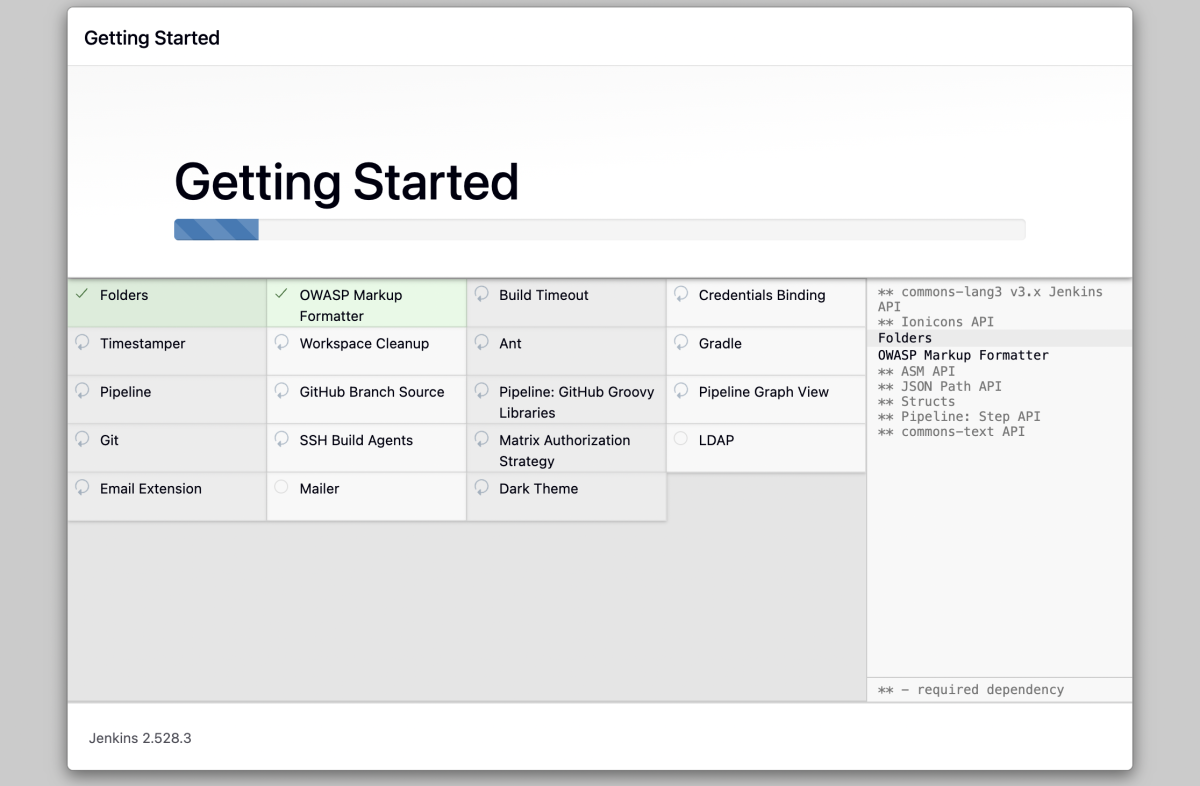 - Allow Jenkins to finish installing all plugins before continuing.