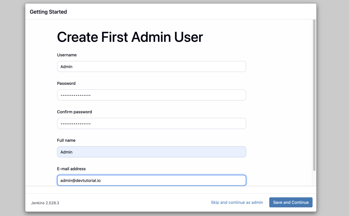 - Create a new Jenkins user by providing a username, password, full name, and email address.