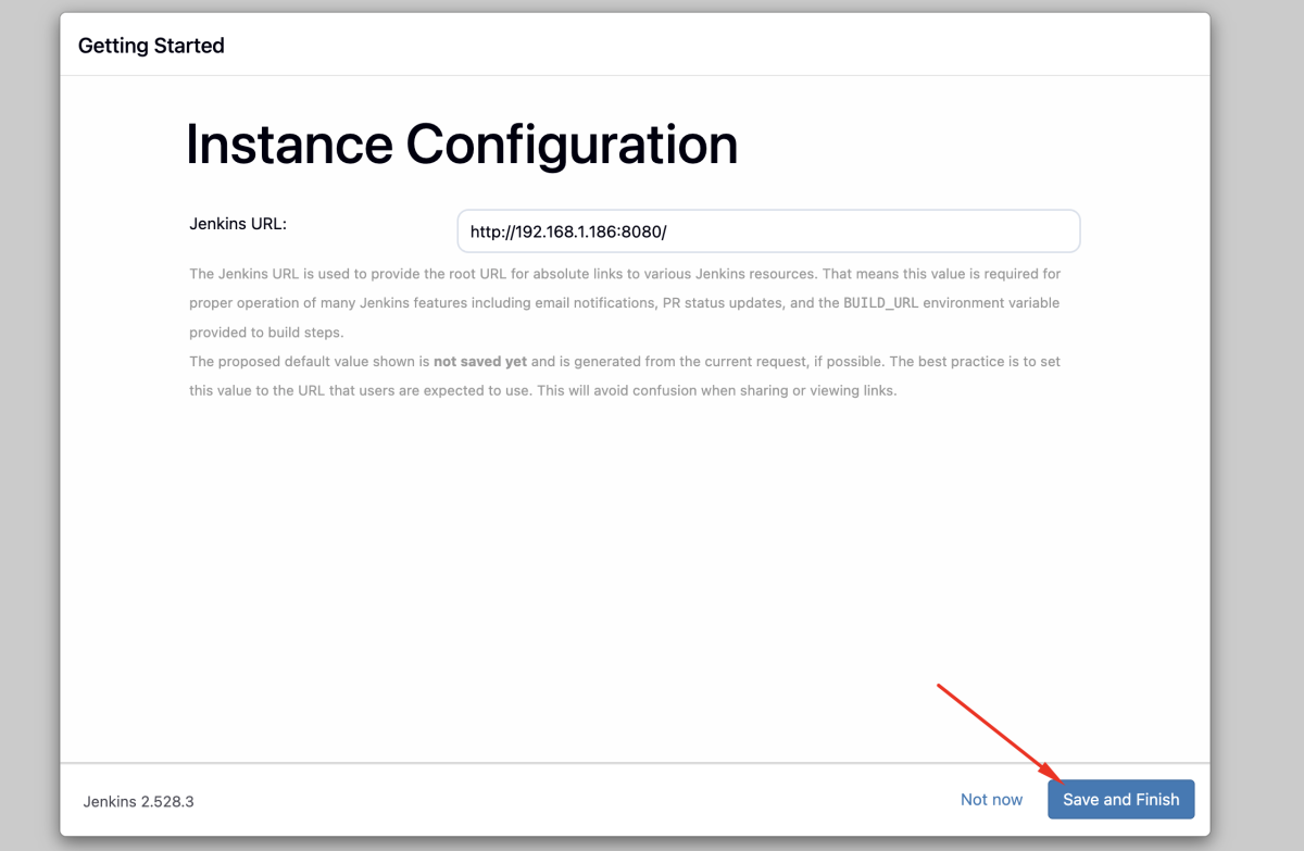 - Confirm or update the Jenkins URL, then save and continue.