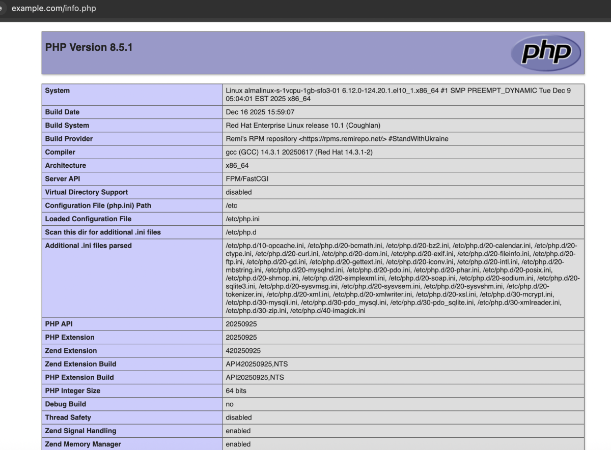 Congratulations! You have successfully installed and configured PHP 8.5 for Nginx on AlmaLinux 10.