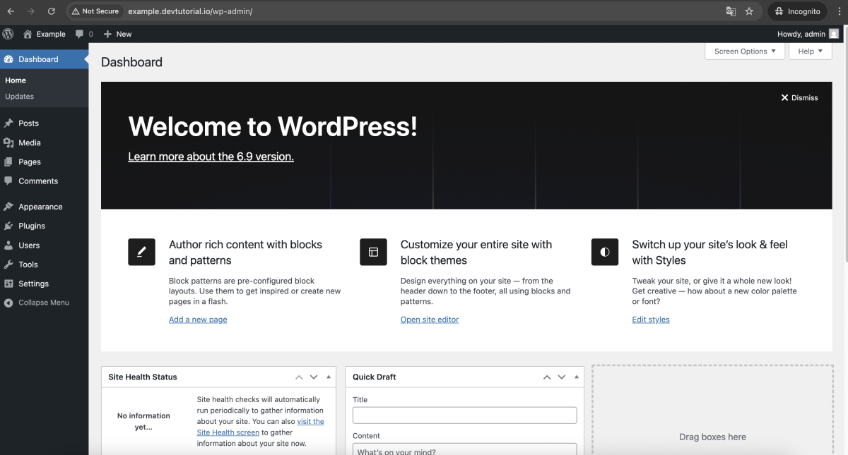 Step 9 : After logging in, you will be redirected to the WordPress Dashboard, where you can start managing your website.